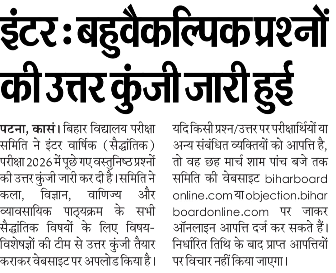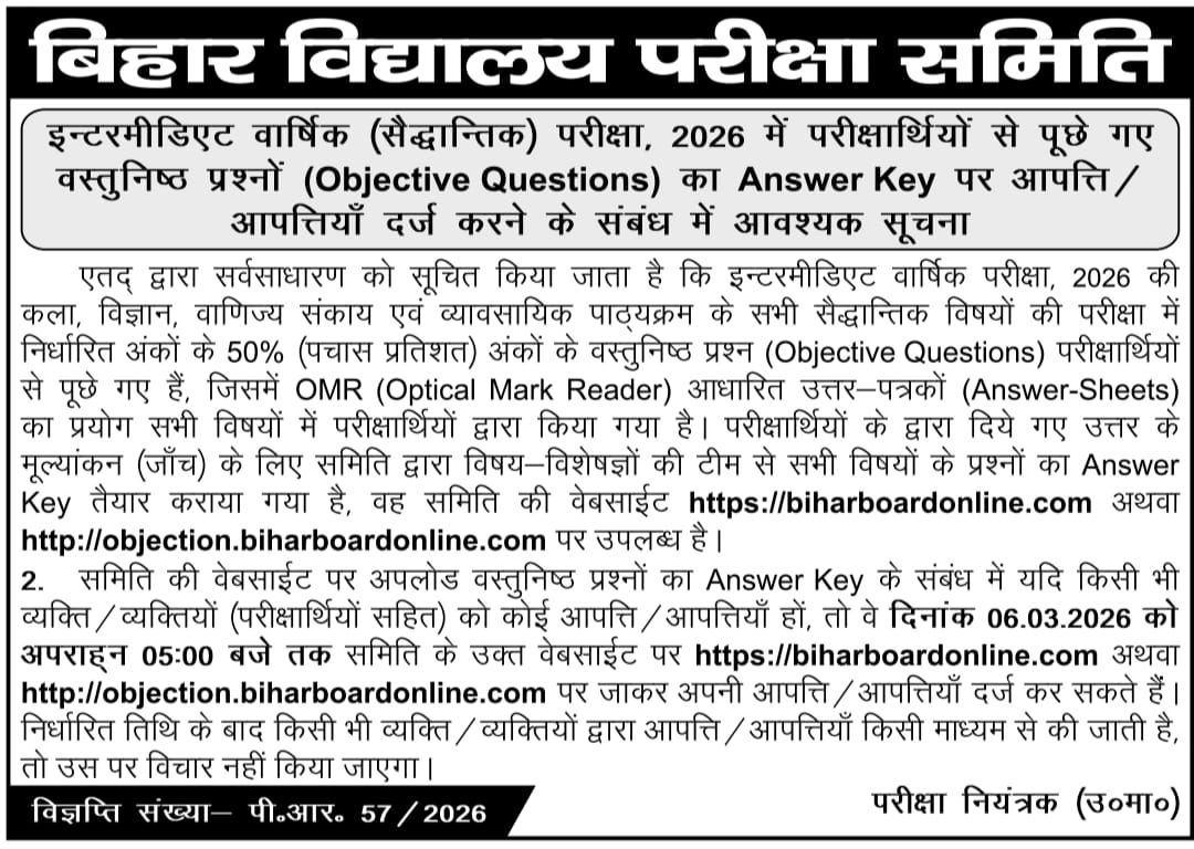 Bihar Board 12th Answer Key 2026 छात्रों के लिए महत्वपूर्ण है। इससे वे अपने प्रदर्शन का आकलन कर सकते हैं और आवश्यकता होने पर निर्धारित समय सीमा के भीतर आपत्ति दर्ज कर सकते हैं। आधिकारिक वेबसाइट से ही अपडेट प्राप्त करें और किसी भी अनधिकृत सूचना पर भरोसा न करें।