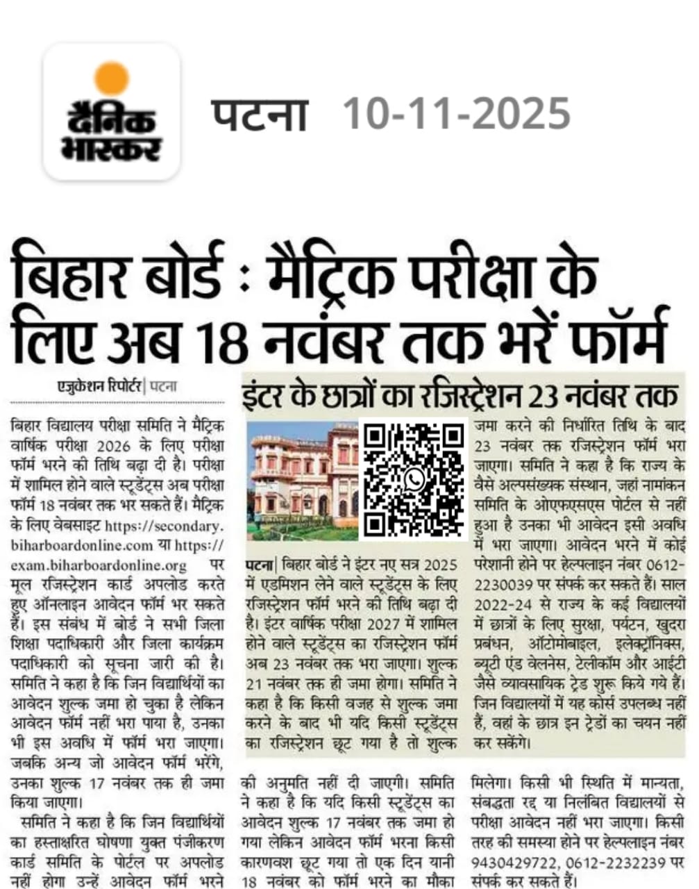 Short Information: Bihar School Examination Board (BSEB) ने मैट्रिक (10वीं) वार्षिक परीक्षा 2026 में शामिल होने वाले छात्रों के लिए Exam Form भरने की अंतिम तिथि बढ़ाकर 18 नवंबर 2025 कर दी है। इससे उन छात्रों को एक और मौका मिल गया है जो किसी कारणवश अपना परीक्षा फ़ॉर्म पहले नहीं भर पाए थे। सभी छात्र अपने-अपने स्कूल में संपर्क करके 18 नवंबर से पहले फॉर्म भरवा लें, ताकि वे 2026 की बोर्ड परीक्षा में शामिल हो सकें।