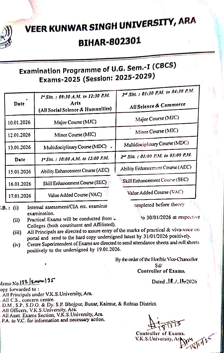 यह जानकारी Veer Kunwar Singh University (VKSU) की आधिकारिक वेबसाइट, नोटिस एवं विश्वविद्यालय द्वारा जारी सूचनाओं पर आधारित है। किसी भी परिवर्तन की स्थिति में आधिकारिक वेबसाइट को ही मान्य समझें।